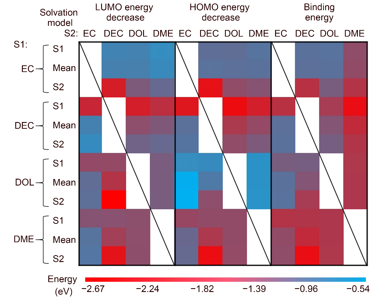 该研究团队进一步将离子–溶剂模型从单一溶剂拓展至多溶剂体系,以深入探究实际电解液中的溶剂化结构和电解液组分的氧化还原稳定性。研究发现,相对于纯溶剂分子,离子–多溶剂复合结构中配位溶剂的最高被占分子轨道(HOMO)和LUMO能级均降低,与Li+–溶剂的平均结合能之间呈现线性正相关规律。这和离子–单溶剂复合结构中溶剂HOMO和LUMO能级的变化规律一致,进一步凸显了离子–溶剂化学规律的普适性。此外,离子–多溶剂复合结构的HOMO/LUMO能级和结合能与其溶剂化环境紧密相关。溶剂化环境介电常数越大,锂离子与溶剂间作用越弱,HOMO与LUMO能级变化越小(图2)。这一发现为设计新型电解液提供了新的思路。