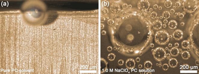 图1. 纯碳酸丙烯酯(PC)溶剂(a)和高氯酸钠-碳酸丙烯酯电解液在Na负极表面分解产气现象比较