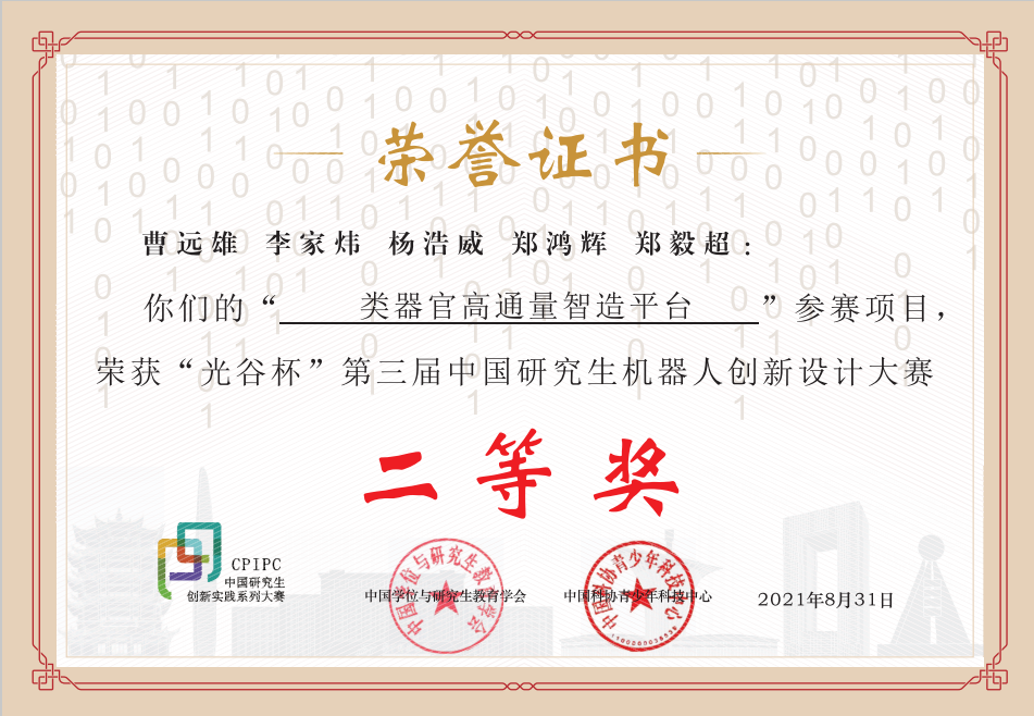 清华新闻网9月15日电 近日,“光谷杯”第三届中国研究生机器人创新设计大赛总决赛举办,来自全国73家培养单位的172支队伍在初赛中脱颖而出,会师巅峰之战。由清华大学深圳国际研究生院生物医药与健康工程研究院、清华-伯克利深圳学院(TBSI)精准医学与公共健康中心马少华副教授课题组的2019级硕士研究生曹远雄、2020级硕士研究生杨浩威和李家炜、2019级博士研究生郑毅超、2020级博士研究生郑鸿辉组成的团队凭借参赛作品“类器官高通量智造平台”项目获得医疗健康专项组二等奖。