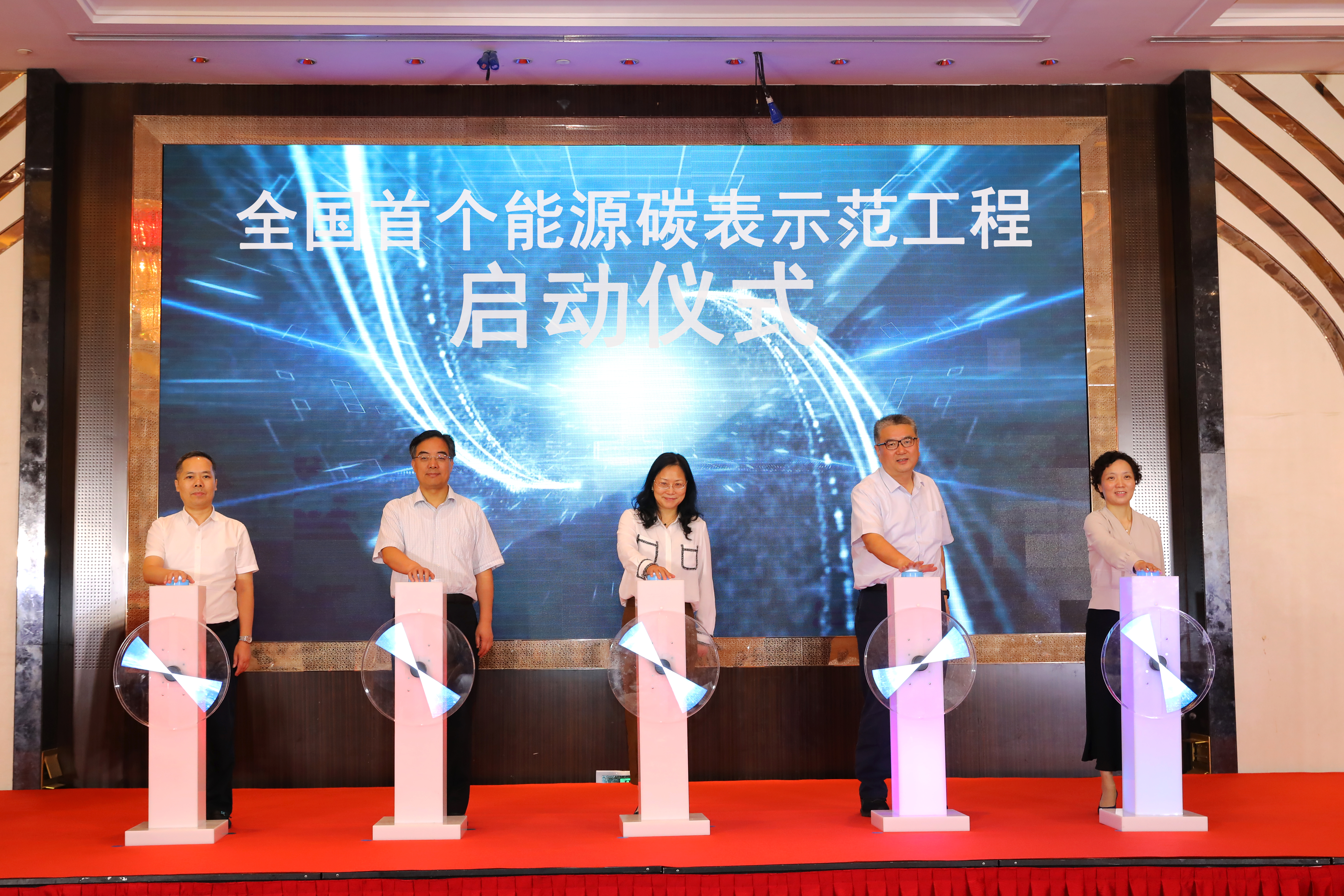 江苏省发改委二级巡视员李义,江苏省电力公司副总经理王之伟,清华大学电机系主任、清华四川能源互联网研究院院长康重庆,常州供电公司总经理李瑶虹,常州市发展和改革委员会副主任朱建江共同按下启动按钮,宣布全国首个电力系统“源网荷”实体碳表装置与碳管理平台正式发布上线。