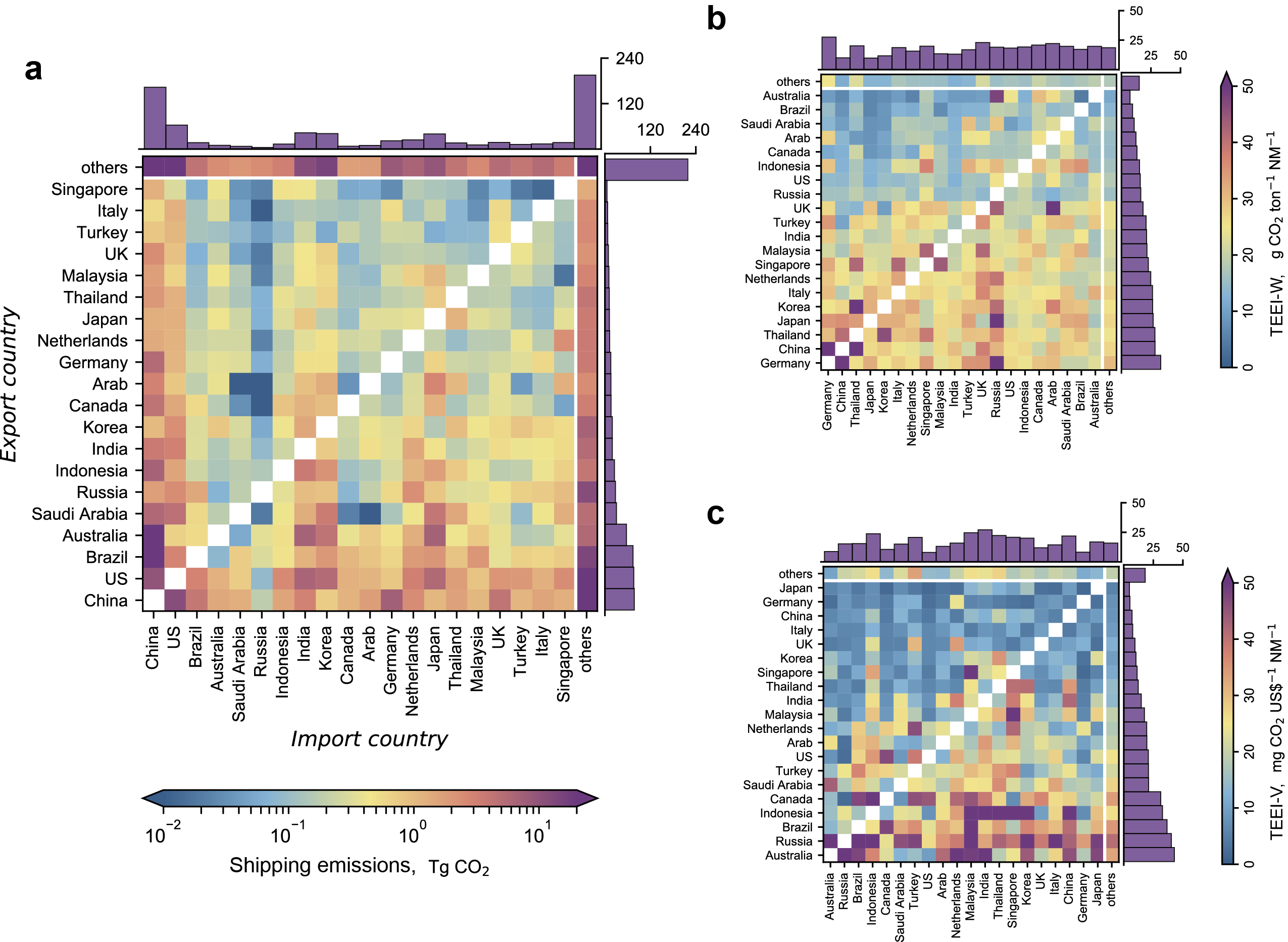 (a) 海运排放矩阵,(b)以重量计的贸易排放效率指数矩阵(TEEI-W),(c)以价值计的贸易排放效率指数矩阵(TEEI-V)。