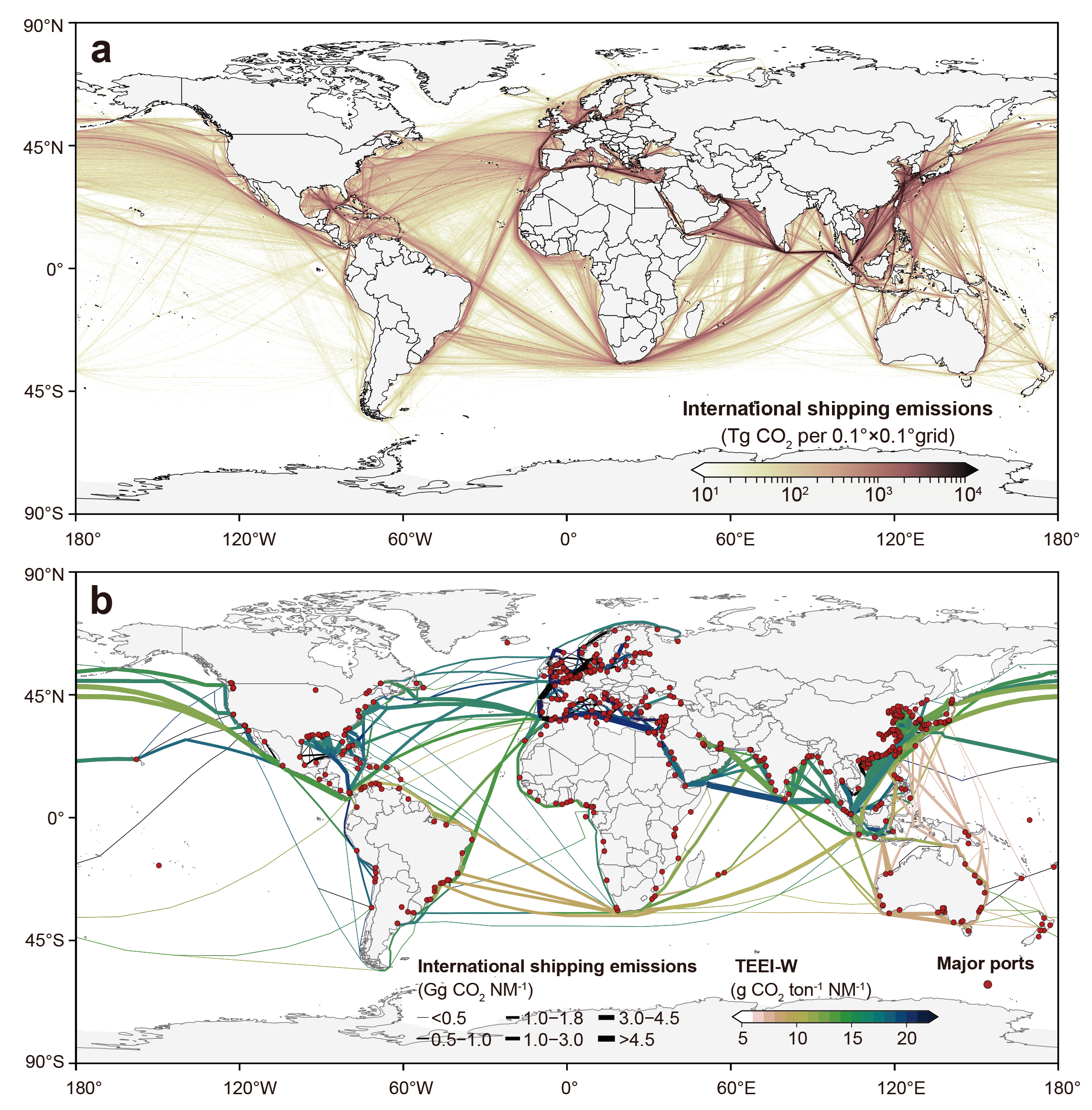 (a)基于船舶识别航程的VoySEIM模型所估算的海运CO2排放,(b)基于双边贸易流量的GTEMS模型估算的海运CO2排放。图b中船舶排放强度(单位为g CO2NM-1)表示通过各航线段的所有贸易运输船舶的累积排放量,而TEEI-W(贸易排放效率指数,单位为g CO2ton-1NM-1)表示该航线的海运排放强度与其运输的所有商品重量之比。