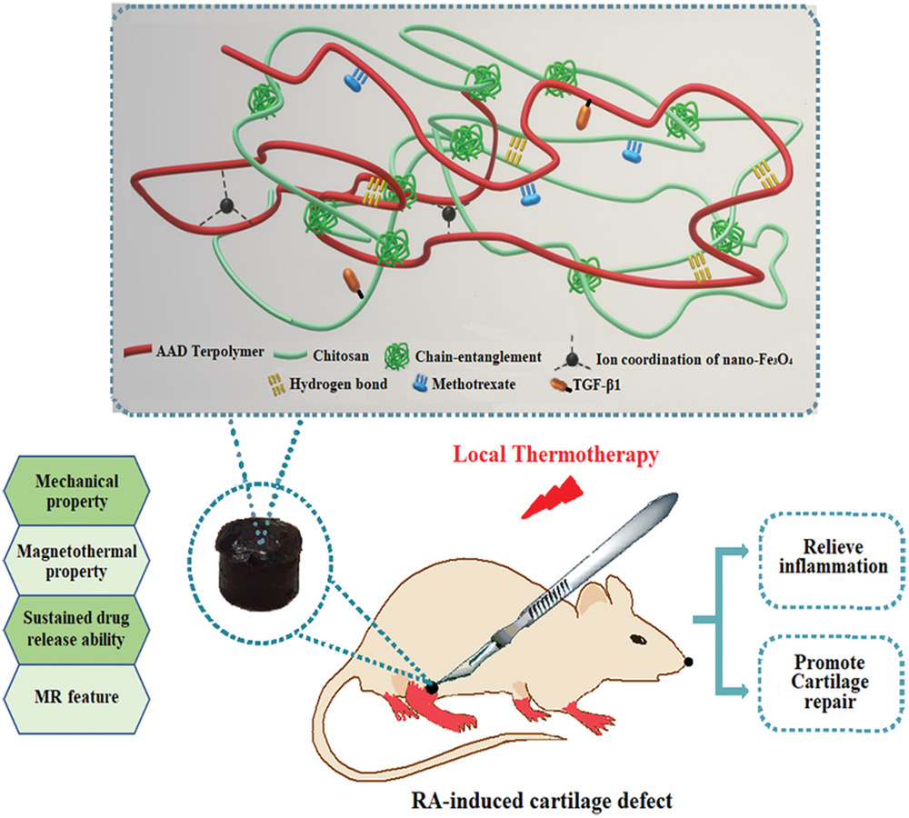 类风湿关节炎(RA)是一种常见的慢性自身免疫性疾病,影响全球1%的人口,导致严重的社会经济问题。RA的特点是大量炎性细胞浸润,大量血管新生,代谢增加,这与肿瘤的特点非常相似。RA会引起滑膜炎症,形成血管翳,侵袭和破坏骨软骨,导致关节损伤。然而,目前针对RA的研究主要都是关注在对于炎症的治疗,而忽略了损伤软骨的再生。在最新的肿瘤治疗研究中,提出了一种消除肿瘤和组织再生的联合治疗方法,这揭示了一种同时杀死增生组织和修复组织缺损的有希望的方法。考虑到类风湿性关节炎和肿瘤之间惊人的相似性,材料学院孙晓丹课题组和苏州大学附属第一医院骨科林俊课题组合作,将一线抗风湿药物(甲氨蝶呤,MTX)和转化生长因子β1(TGFβ1)负载于纳米Fe3O4复合壳聚糖聚烯烃构建的多功能双网络水凝胶(DN-Fe-MTX-TGFβ1)中。该水凝胶的力学性能与关节软骨相当,以保证其作为力学支撑支架的稳定性。水凝胶的长期释放能力和磁热性质确保了其提供持续局部热化疗的效果。在DN-Fe-MTX-TGFβ1水凝胶上,巨噬细胞的激活被显著抑制,表明热化疗具有良好的抗炎作用。同时,在DN-Fe-MTX-TGFβ1水凝胶上,骨髓间充质干细胞的软骨分化显著改善,有望促进软骨缺损的修复。体内实验证实,多功能水凝胶具有协同抑制炎症和促进软骨再生的作用。当热化疗与组织工程结合治疗类风湿关节炎时,这些结果显示了广阔的应用前景。