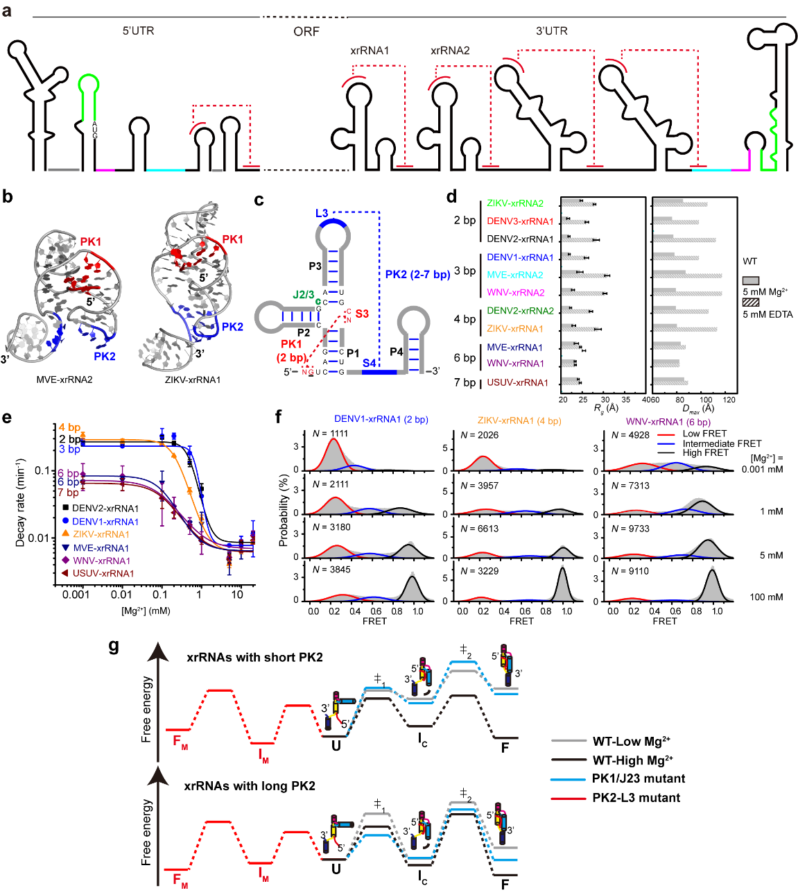 接下来,研究者整合小角X射线散射(SAXS)、smFRET以及抗Xrn1酶切动力学实验技术,研究了来自黄病毒家族的11种PK2长度不同(2-7bp)的xrRNA在溶液中的折叠、构象动态及抗Xrn1酶切活性(图1d-f)。SAXS和酶切实验数据表明,xrRNA在溶液中的折叠(图1d)和抗酶切活性(图1e)均高度依赖于[Mg2+],并且受到PK2长度的调控,PK2长度较长的xrRNA在较低的Mg2+浓度即可折叠为环状高级结构并具备抵抗酶切的能力。smFRET实验数据表明(图1f),xrRNA在溶液中是高度动态的,存在未折叠态、中间态及折叠态三种状态,三种状态的比例分布受到[Mg2+]及PK2长度的协同调控,其动力学遵循由未折叠态到中间态再到折叠态的折叠路径。xrRNA在折叠态的比例与酶切降解速率之间的负相关性表明,xrRNA只有进入折叠态时才能抵抗酶切,并且受到解折叠动力学过程(由折叠态到中间态或未折叠态)的控制,因而,xrRNA的结构、构象动态与其抗酶切功能密切相关。进一步的研究表明,在高[Mg2+]条件下,PK2较长的xrRNA可以缓解因三级相互作用模体如PK1或J2/3的突变而对其结构、动态特性和抗酶切活性的影响。综合这些实验结果,研究者们提出了黄病毒xrRNA在溶液中受Mg2+及PK2长度协同调控的折叠自由能面图(图1g)。这些研究成果揭示了黄病毒xrRNA的结构、构象动态与功能之间的高度相关性和由三级相互作用模体调控RNA构象动态与功能的新机制。