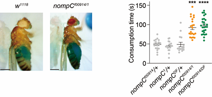 图2. 机械力受体nompC基因突变导致果蝇的进食量上升