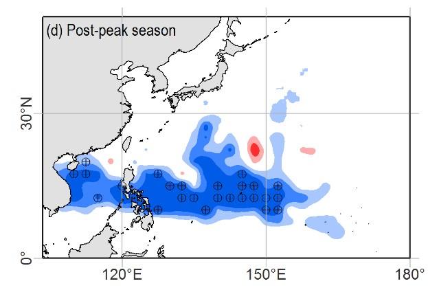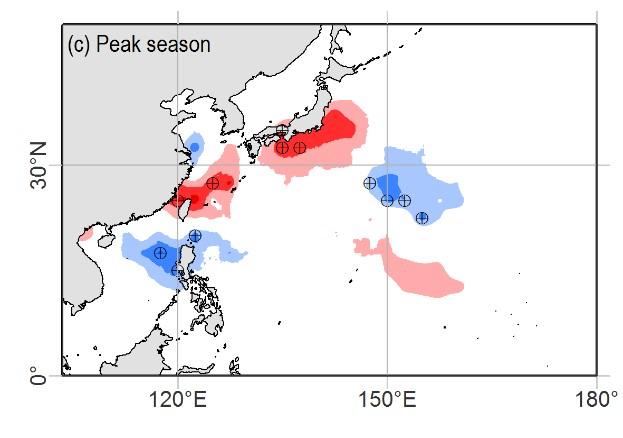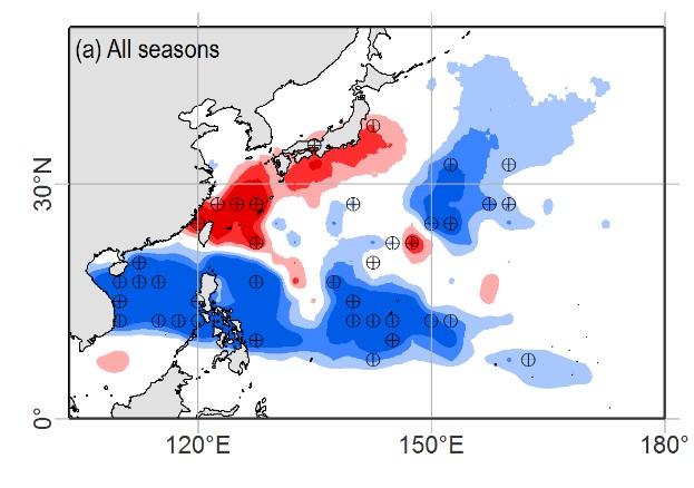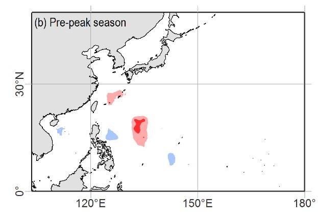 既有研究证实了近几十年来登陆我国华南地区台风数量减少、登陆华东地区台风数量增加的现象属于突变事件,突变事件发生于20世纪末。那么,能否将其简单理解为台风登陆位置由华南地区向北偏移至华东地区呢?答案并非如此。清华大学近岸海洋动力学研究团队研究首先指出,登陆华南地区台风数量减少和登陆华东地区台风数量增加是两个独立的现象。其中,登陆华南地区的台风数量减少是由于西行台风在10-12月显著减少,这一现象与西北太平洋台风生成数量减少有关;登陆华东地区的台风数量增加是由于西北行台风在7-9月显著增加,这一现象与西北太平洋台风生成位置向西偏移有关。