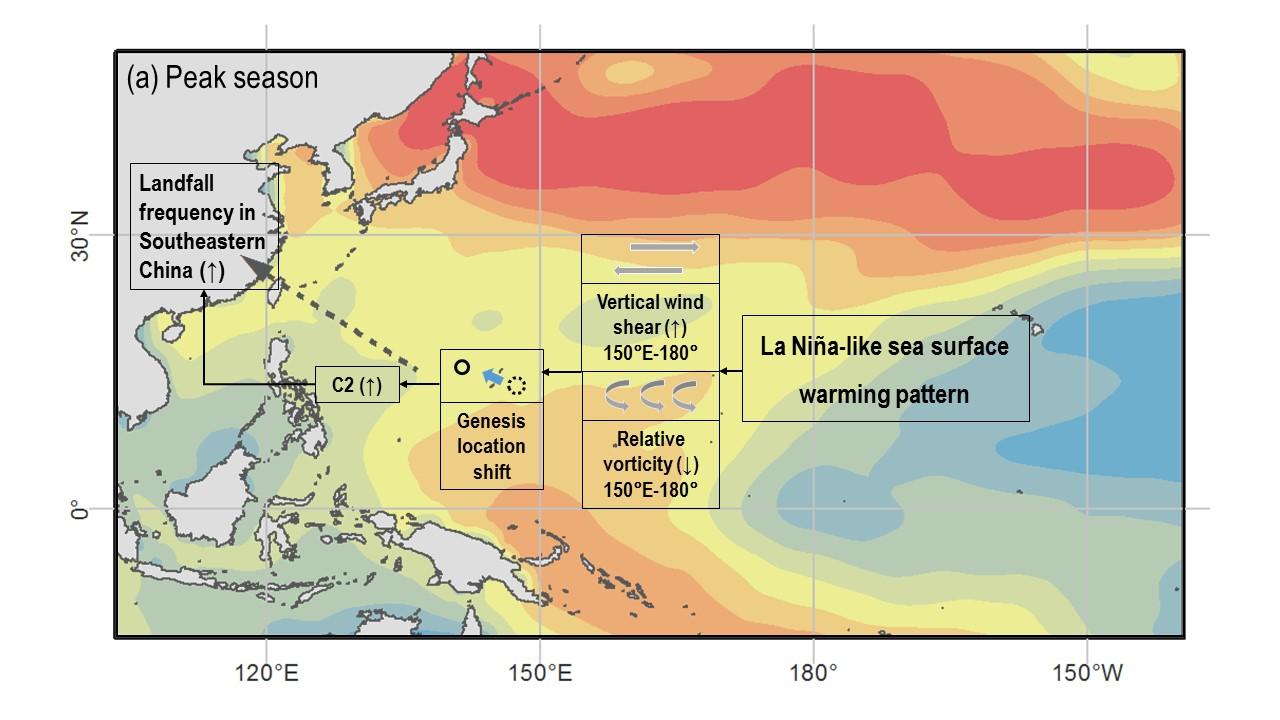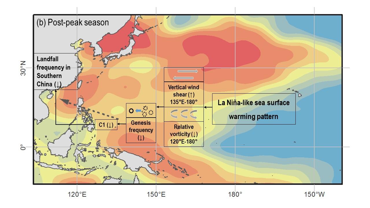 进一步地,该研究提出两个现象实际由共同的物理机制引起,均归因于20世纪末西北太平洋海温出现的类拉尼娜升温模态。20世纪末以来,西北太平洋海表出现类拉尼娜升温模态,表现为西部海表升温速率明显高于东部,这一升温模态加速纬向大气环流圈,引起相对涡度减小和垂直风切变增加,二者是西北太平洋台风生成的不利条件。其中,大气环流圈在7-9月的纬向延伸范围较小,主要影响西北太平洋东部,纬向大气环流圈加速带来的相对涡度减小和垂直风切变增加,导致西北太平洋东部台风生成减少,再加上西北太平洋西部海表显著升温为西部台风生成带来的有利条件,从而导致西北太平洋台风在7-9月生成位置整体向西偏移;而大气环流圈在10-12月的纬向延伸范围较大,几乎覆盖整个西北太平洋海域范围,从而导致西北太平洋台风在10-12月生成数量减少。