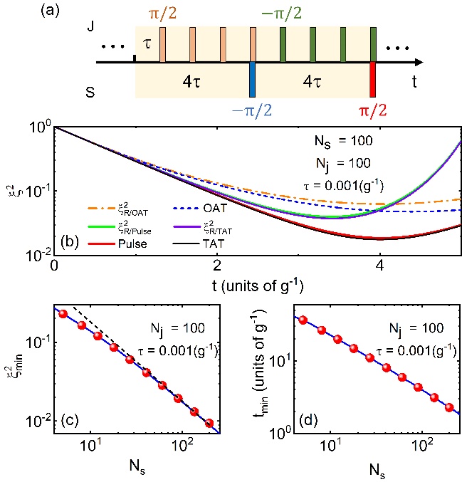 图2:(a)实现双轴扭曲型自旋压缩的脉冲方案示意图;(b)压缩系数随时间的演化;(c)-(d):最佳压缩度和最佳压缩时间关于系统粒子数的标度律。