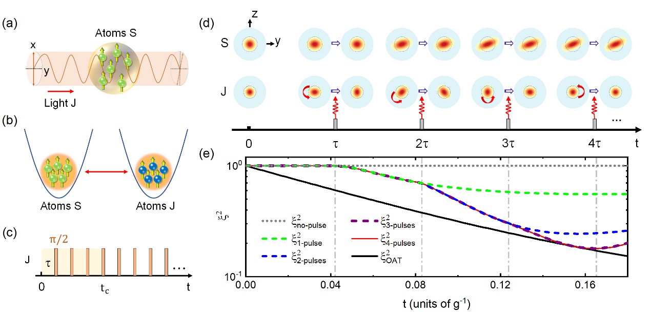 图1:(a)(b)光-原子相互作用系统和偶极-偶极相互作用系统示意图;(c)典型脉冲方案示意图;(d)在脉冲方案作用下两个子系统各自的量子态演化,这里在Bloch球上画出了量子态的准概率分布;(e)不同脉冲数下压缩系数随时间的演化。