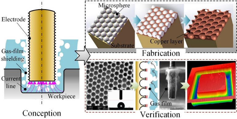 清华大学机械工程系精密微纳制造工艺与装备研究团队在前期采用侧壁绝缘膜微细电解加工研究基础上,面向解决侧壁绝缘膜不可靠、易损耗的问题,提出了一种微细工具电极侧壁疏水表面形成的“无形”绝缘气膜提高微细电解加工定域性的方法。该方法探索出单层模板自组装工艺和微细电铸工艺,制备出微纳米尺度球形阵列内凹坑构建的新型侧壁疏水表面微细工具电极。微结构微细电解加工实验表明,这种方法能有效抑制微细电解加工中侧壁杂散腐蚀,提高了微细电解加工的定域性精度。此研究为解决一直困扰微细电解加工杂散腐蚀问题提供了新的解决思路和方案,在微细棒状金属表面构建疏水表面、微结构微细电解加工等领域具有重要的学术价值和应用前景。