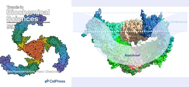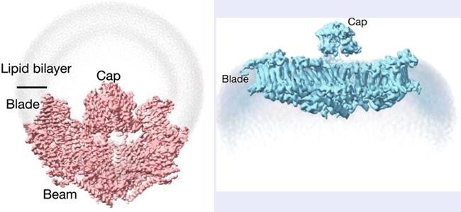 图1 PIEZO通道的三聚体三叶螺旋桨状(左图,俯视图)与纳米碗状(右图,平视图)三维结构