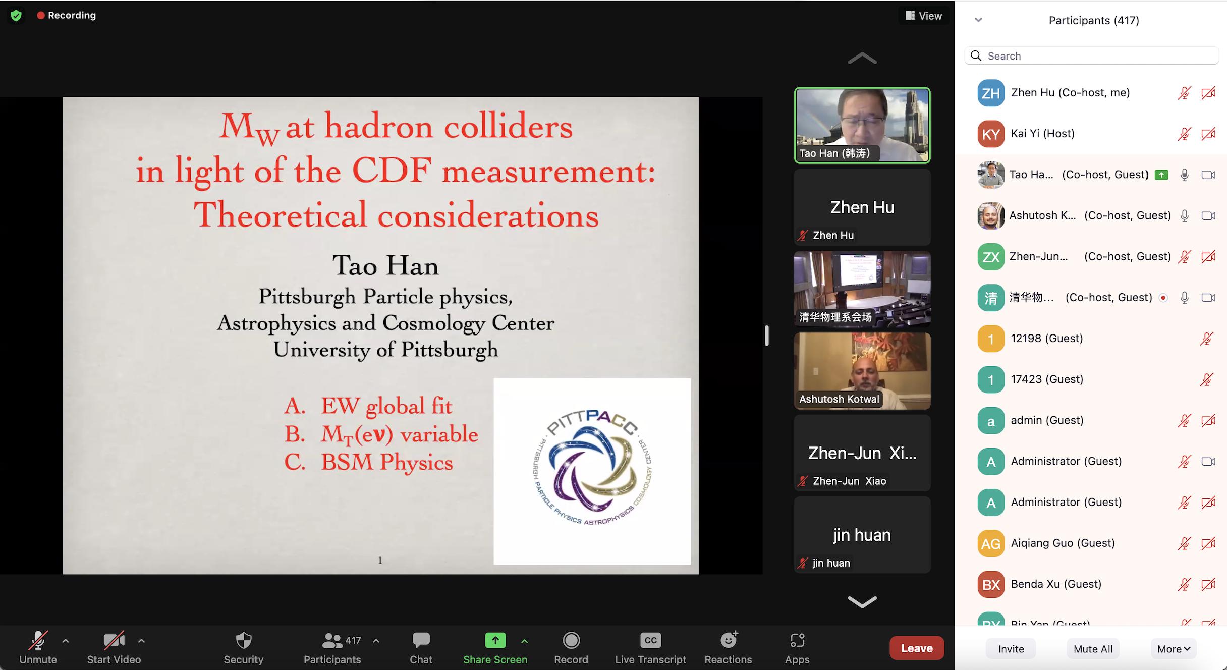 为了促进中国物理同行之间以及与国际同行的学术交流,清华大学、南京师范大学、中科院高能物理研究所、北京大学联合发起并主办了本次“W玻色子质量研讨会”。4月14日,来自国内外近百所高校和研究所的专家及学者约500人线上线下参加了会议,同时间段有近7000人次在线观看了直播。中国物理学会高能物理分会副主任、北京大学核物理与核技术国家重点实验室主任、北京大学物理学院院长高原宁院士,北京大学赵光达院士,中科院理论物理研究所张肇西院士,美国匹兹堡大学粒子物理天体物理宇宙学中心主任、美国物理学会“粒子物理与场论”分部主席韩涛教授,国家特聘专家、中科院高能所研究员祝翱(Joao Guimaraes da Costa)等参加了会议和讨论。