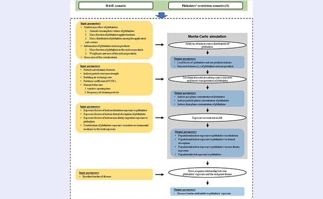 近日,清华大学建筑学院赵彬教授与合作团队的最新研究成果揭示了在不同PAE使用限制情景下,归因于PAE暴露带来的2型糖尿病和肥胖症的疾病负担的减少特征,为制定合理的PAE使用限制政策提供了理论依据。研究团队采取自上而下的研究思路,基于我国消费PAE的质量流动数据,利用PAE“在用质量—室内浓度—人体暴露—疾病负担”这一顺序模型(图1),在严格至宽松的三种不同的PAE使用限制政策实施情境下,估计PAE所带来的成人2型糖尿病及肥胖疾病负担,并将之与未采用PAE使用限制政策的“基准”情境下的疾病负担作比较,得出相应的PAE使用限制政策所带来的健康效益。
