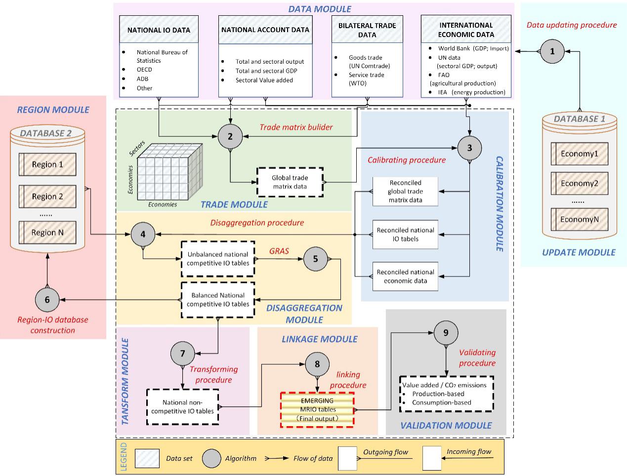 针对上述问题,清华大学地学系关大博教授研究组联合伦敦大学学院、挪威科技大学、格罗宁根大学和上海财经大学等多家机构学者,创新多源数据融合方法,构建了模块化的全球全区域投入产出模型编制框架(EMERGING MRIO)。EMERGING MRIO是由中国学者领衔研发、具备完全自主知识产权、聚焦于新兴经济体的全球全区域投入产出数据库。与现有数据库相比,EMERGING数据库具有以下5个特点:1.国家分辨率高,全面覆盖了全球所有经济体的经济与贸易信息;2.行业分辨率高,全面反应制造业及服务业供应链的结构变化特征;3.时间覆盖范围广,覆盖了2010年以来的多个历史年份;4.近实时更新,能够反映最新的贸易变化及政策影响;5.采用模块化编译流程,各个模块之间互不影响,减少了各步骤之间的耦合过程,提高了编译效率。