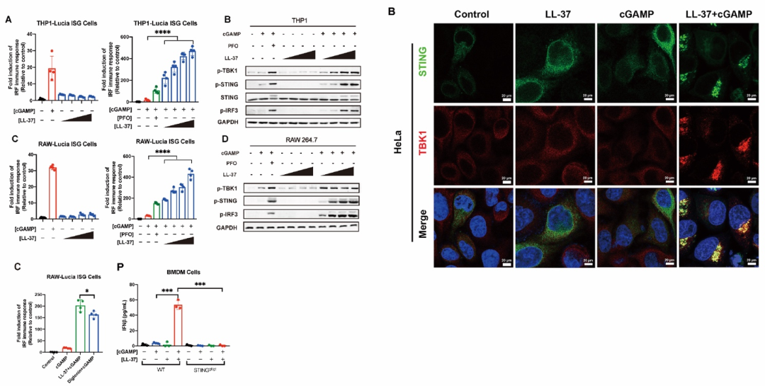 图1. LL-37促进cGAMP强烈激活STING信号通路和干扰素反应