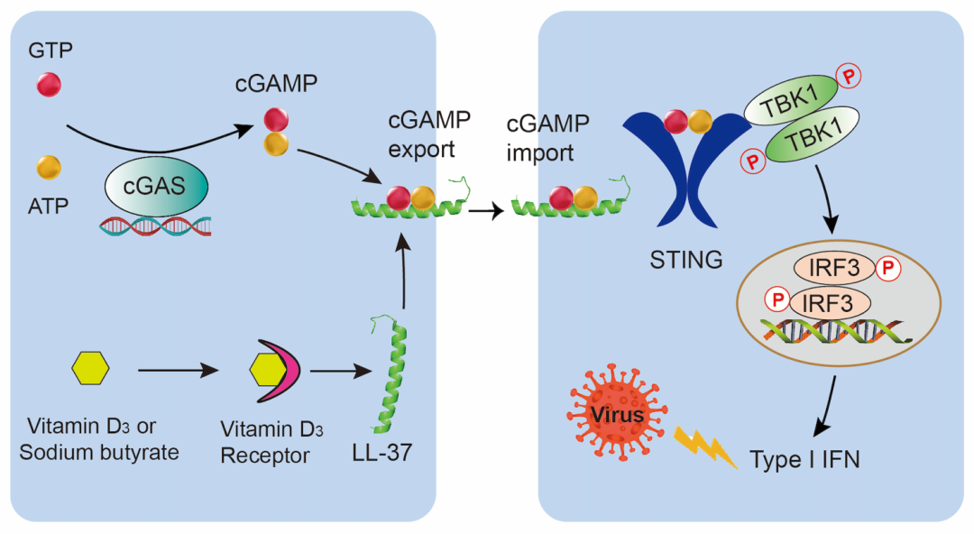 研究表明补充VD3可以增强基于IFNβ的抗病毒反应,并有证据显示补充VD3甚至可以缓解SARS-CoV-2诱发的急性呼吸道综合征。尽管早有研究报道VD3能够诱导内源性LL-37的产生,但尚不清楚VD3诱导的LL-37表达与IFNβ介导的抗病毒反应之间是否存在联系。该研究证明,VD3通过诱导内源LL-37的表达,促进了cGAMP的跨膜转运,从而高效激活STING信号通路并促进IFNβ介导的抗病毒免疫反应,解开了这个困扰人类几十年的谜题。