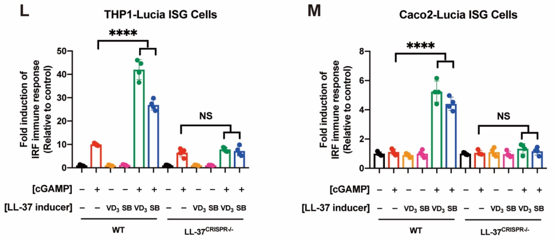 图2. VD3和SB通过诱导内源LL-37表达促进cGAMP介导的STING信号激活