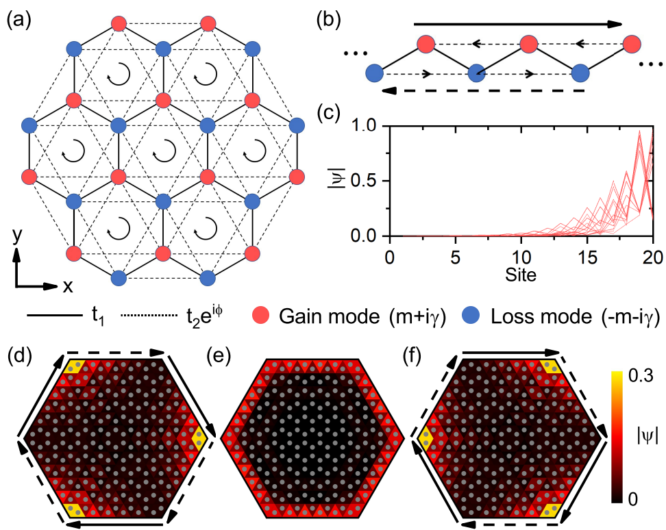 图1.模型图和典型结果。(a)为模型图,考虑非厄米Haldane模型,对应具有次近邻耦合的六角蜂窝晶格,其中红(蓝)色格点表示带有增益(耗散)。(b)为单独考虑系统锯齿(zigzag)边的模型图。(c)为与(b)对应的本征模式分布,显示所有模式都向右趋肤。(d)-(f)为六边形边界情况取不同增益耗散参数时拓扑边界模式的分布,其中(d)γ<0,(e)γ=0,(f)γ>0