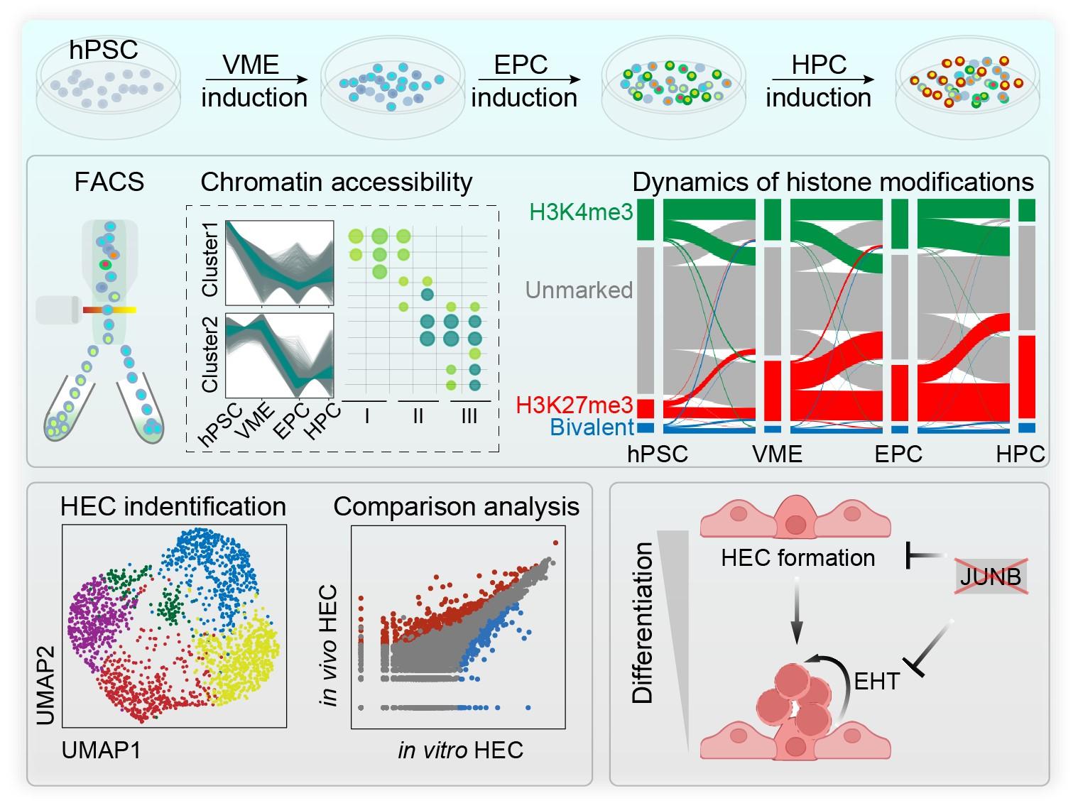清华新闻网6月8日电 造血干祖细胞(hematopoietic stem progenitor cell,HSPC)存在于成体骨髓内,具有长期自我更新能力,同时能够分化为所有类型的血细胞和免疫细胞,因此在疾病治疗上具有重要的价值。人类胚胎HSPC发生过程的单细胞转录组图谱研究显示了独特的动态变化规律,但是受材料和技术的限制,人胚胎HSPC发育过程中的染色质开放状态、重要组蛋白修饰的表观遗传图谱及基因表达调控机制仍未被揭示。人多能干细胞(human pluripotent stem cell, hPSC)向造血祖细胞(hematopoietic progenitor cell,HPC)分化的体系为探究HSPC生成过程中的表观遗传调控提供了可进行实验操作的平台。