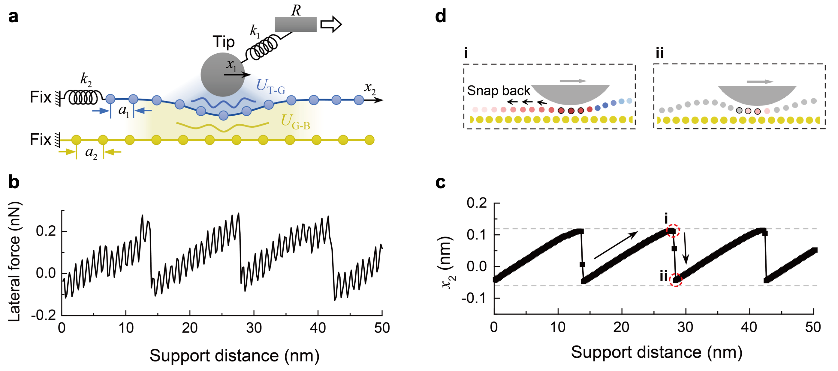 为了理解这种独特的双周期“粘-滑”摩擦行为背后的物理机制,研究团队发展了一个考虑石墨烯变形能和层间堆垛状态的改进P-T模型,如图2所示。借助该理论模型和数值计算,进一步揭示了实验中观察到的双尺度“粘-滑”摩擦行为可能源于探针压力作用下局部堆垛转变诱导的异质界面变形。传统P-T模型中,探针失稳跳跃是原子尺度“粘-滑”摩擦现象发生的核心机制,但该研究表明,对于层状范德华材料,探针压力作用下二维材料原子层内部应变的积累和释放也会导致独特的摩尔超晶格尺度的“粘-滑”摩擦行为,如图2所示。该发现进一步拓展了人们当前对于粘-滑摩擦背后力学机制的认知,也为调控范德华层状材料表面的摩擦行为提供了一种新策略。