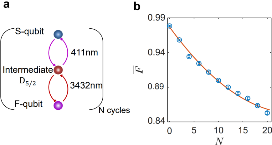 为了避免在辅助操作过程中辅助比特自发辐射的光子破坏附近的数据比特中储存的量子信息,此前的离子阱量子计算研究需要采用两种不同种类的离子分别担任这两种类型的量子比特,但实现不同种类离子之间的高保真度量子纠缠逻辑门极具挑战,且随着离子阵列规模的扩大,调控两种类型离子的分布及位置并实现协同冷却也愈发困难。