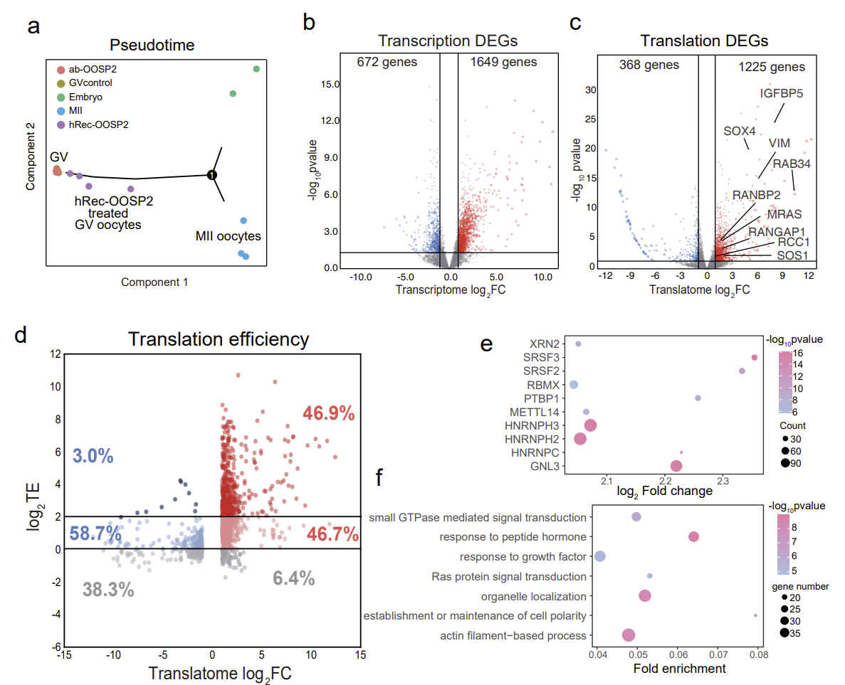通过使用单细胞双组学T&T-seq揭示了人重组蛋白OOSP2处理过的GV期卵母细胞的转录组和翻译组,鉴定了OOSP2的潜在诱导基因或途径。OOSP2可以直接调控下游基因的翻译,并通过上调特定的信号通路,如小GTPase信号通路、细胞器定位通路等,来促进卵母细胞的核质成熟。拟时序分析也证明相比于未成熟卵子,OOSP2蛋白处理过的卵母细胞更接近于成熟卵子(图6)。