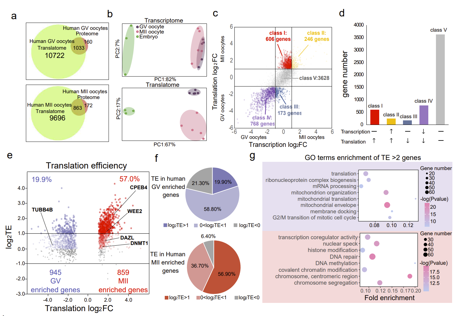 该研究利用T&T-seq技术,描绘了小鼠和人类卵母细胞成熟过程中的转录组和翻译组图谱。结果显示,将T&T-seq中获得的翻译组学数据与最近使用100个人类生发泡(GV)或减数分裂第二期(MII)卵母细胞的蛋白质组学数据进行比较。T&T-seq翻译组能够鉴定出大约高出10倍的翻译基因数量并且需要更少的细胞使用量(图2a)。作者分别对转录组和翻译组的数据进行了组学聚类分析(PCA)。结果发现转录组的 PCA 中卵母细胞和胚胎分离良好,但是GV和MII卵母细胞有部分重叠。 相比之下,使用翻译组的相同样本的PCA清楚地分离了GV卵母细胞、MII 卵母细胞和胚胎,表明了翻译组要比转录组更能够表现GV和MII卵子之间的差异(图2b)。为了进一步了解转录组和翻译组的全基因组变化,作者使用转录组和翻译组同时分析了GV和MII卵母细胞中的差异基因。根据基因在卵子成熟过程中转录-翻译组的表达水平,作者将这些基因进行了分类。总体而言,大多数表达的基因在在卵子成熟过程中(I+III+IV+V 类)的转录水平保持不变或降低。这点与哺乳动物卵母细胞成熟过程中全基因组转录失活的传统模型是一致的(图2c-d)。此外,在成熟卵子中,基因的翻译效率也要高于未成熟的卵子(图2e,f)。