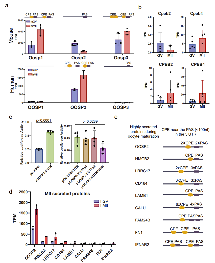 综上所述,本研究开发出了适用于单个卵母细胞的T&T-seq,首次揭示人卵翻译双组学图谱,揭示了人类卵子成熟过程中的时空顺序调节;揭示了小鼠和人类两个物种的卵子成熟过程中的翻译组学图谱的异同;阐释了CPE基序对卵子成熟过程中分泌蛋白翻译的调控作用;鉴定出OOSP2分泌蛋白对卵子的成熟具有重要的作用;揭示了OOSP2可能通过调控小GTPase(蛋白名)信号通路相关蛋白的翻译来促进卵母细胞的成熟,为临床卵母细胞体外成熟技术提供新的技术方法及理论依据。