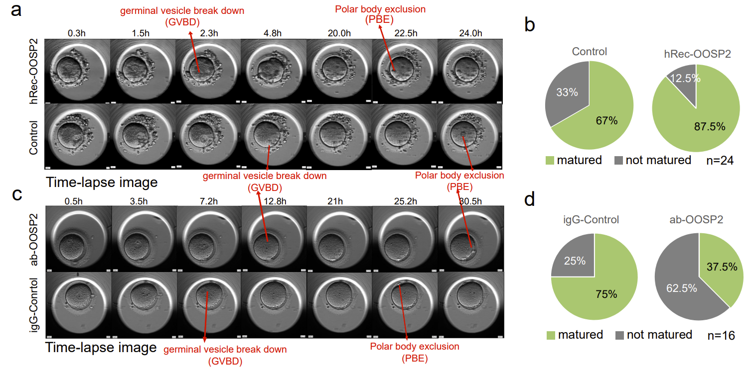 研究发现了添加OOSP2蛋白可以提高人卵体外成熟率,並揭示了 OOSP2诱导卵母细胞成熟的分子机制。为了探究OOSP2是否对卵子的成熟具有调控作用,作者从捐赠者收集了GV卵母细胞,并使用带有延时显微镜的孵化器来监测卵母细胞的成熟。生发泡破裂(GVBD)和极体排出(PBE)是在显微镜下卵母细胞成熟后形态变化的两个阶段(图5)。当观察到PBE时,卵母细胞则被认为是成熟的。在每组实验中作者比较来自相同供体的成对GV卵母细胞,以消除不同供体的异质性,并且分别记录了实验组和对照组卵子的GVBD的时间以及PBE的时间。作者发现添加OOSP2蛋白可以提高人卵体外成熟率。而添加OOSP2的抗体则会阻断了OOSP2蛋白的功能,从而影响了卵子的成熟过程。