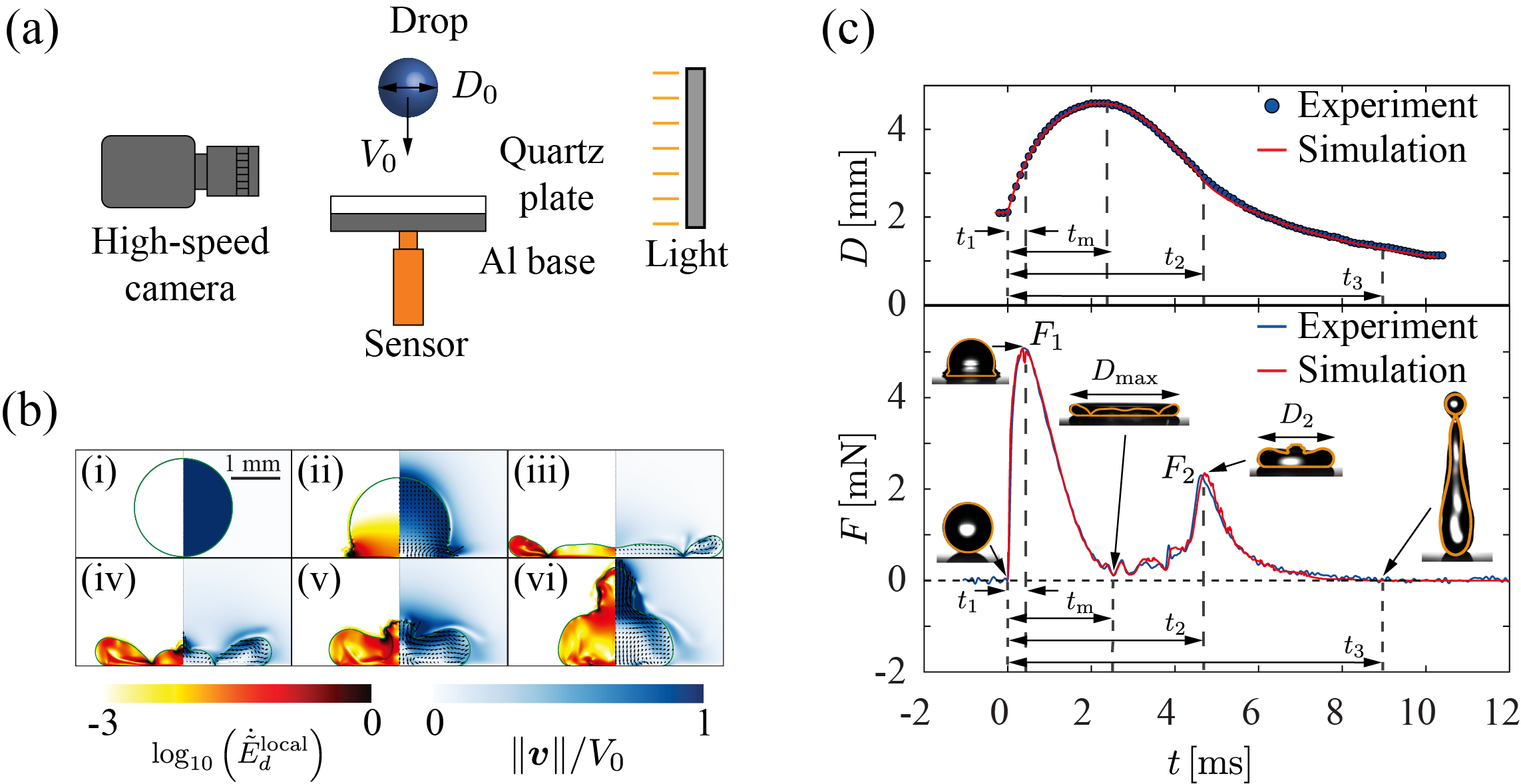 图1.水滴撞击超疏水表面的液滴形态和作用力:(a)实验装置示意图,(b)水滴形态演化的数值模拟,(c)水滴形态和作用力随时间的演化