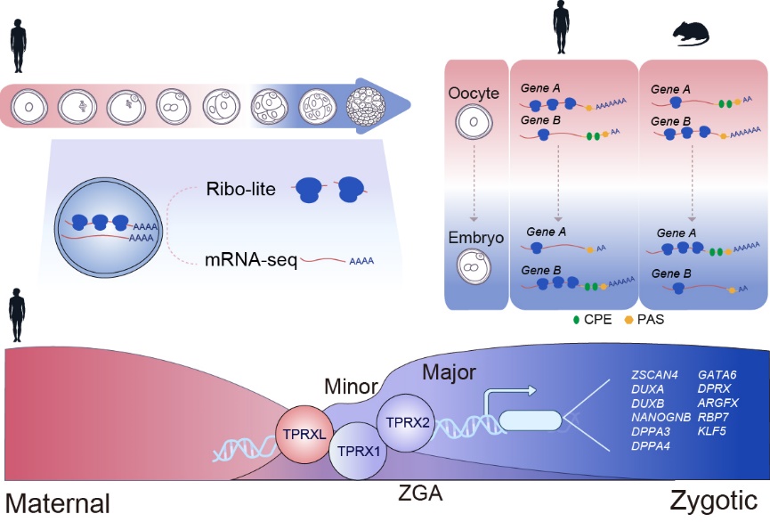 通过结合超灵敏翻译组测序技术Ribo-lite(Ligation-free,ultra-low-InpuT and Enhanced Ribo-seq)和转录组测序技术(Smart-seq2)而开发出的Ribo-RNA-lite(R2-lite)方法可以进行翻译组与转录组联合测序,该方法被应用于人类卵子和早期胚胎共8个时期。清华大学生命学院颉伟教授课题组与其合作者经翻译组分析比较发现,在卵子向早期胚胎转变过程中,人-鼠同源基因中有一半呈现保守的翻译水平动态变化趋势,而另一半呈现不同的翻译水平动态变化趋势,例如编码表观遗传重编程因子、小RNA生物学合成酶等基因。并且这种物种特异性的翻译变化是部分由于(3’ UTR)的关键调控序列,例如胞质多聚腺苷酸化元件(cytoplasmicpolyadenylation element,CPE)和多聚腺苷酸化信号位点(polyadenylation signal site,PAS)的差异排布导致的。