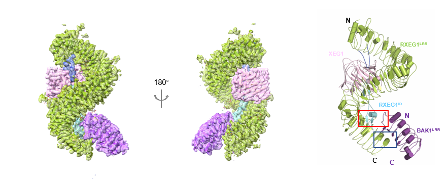 研究发现RXEG1主要通过胞外N端帽子和C端岛区形成的两个独特的loop结合XEG1。通过对RXEG1单独冷冻电镜结构和受体-配体识别(RXEG1-XEG1)晶体结构的比较,发现XEG1的结合引起了RXEG1岛区及C末端的构像发生明显的变化,这种改变诱导共受体BAK1的结合并进一步稳定RXEG1岛区和C端4个LRR基序的构象变化。受体-配体-共受体活化复合物(RXEG1-XEG1-BAK1)结构显示XEG1并不直接参与RXEG1与共受体BAK1的互作,而是通过别构效应间接促进RXEG1与BAK1的异源二聚化。体内生化和功能分析也明确了XEG1诱导RXEG1岛区构象改变进而诱导BAK1结合形成异源二聚体来激活下游免疫信号通路的分子机制。