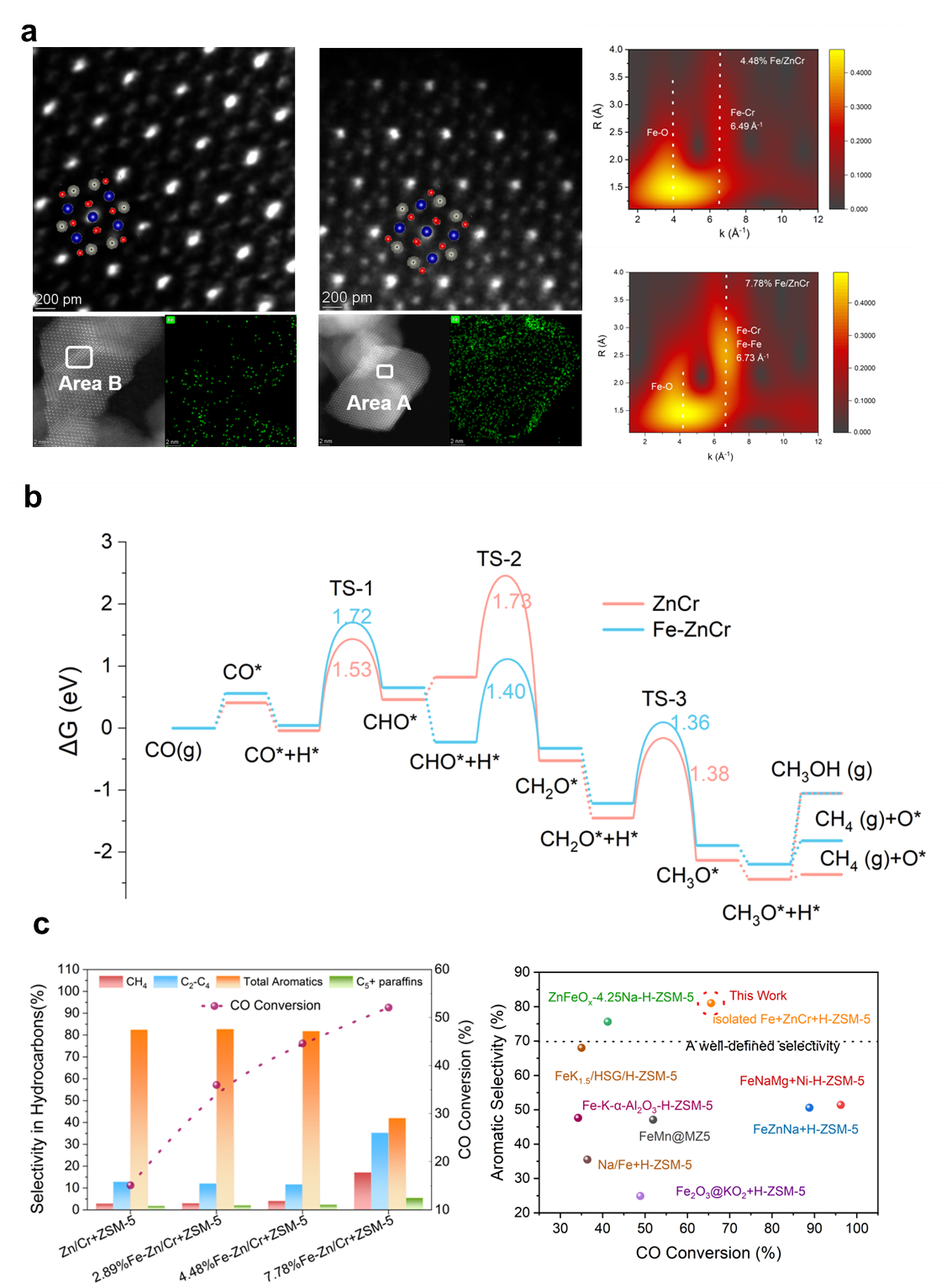 图1.(a)在ZnCr2O4尖晶石16d位点实现Fe的自发单分散;(b)单分散Fe对反应路径的影响;(c)在维持高芳烃选择性的前提下实现深度加氢