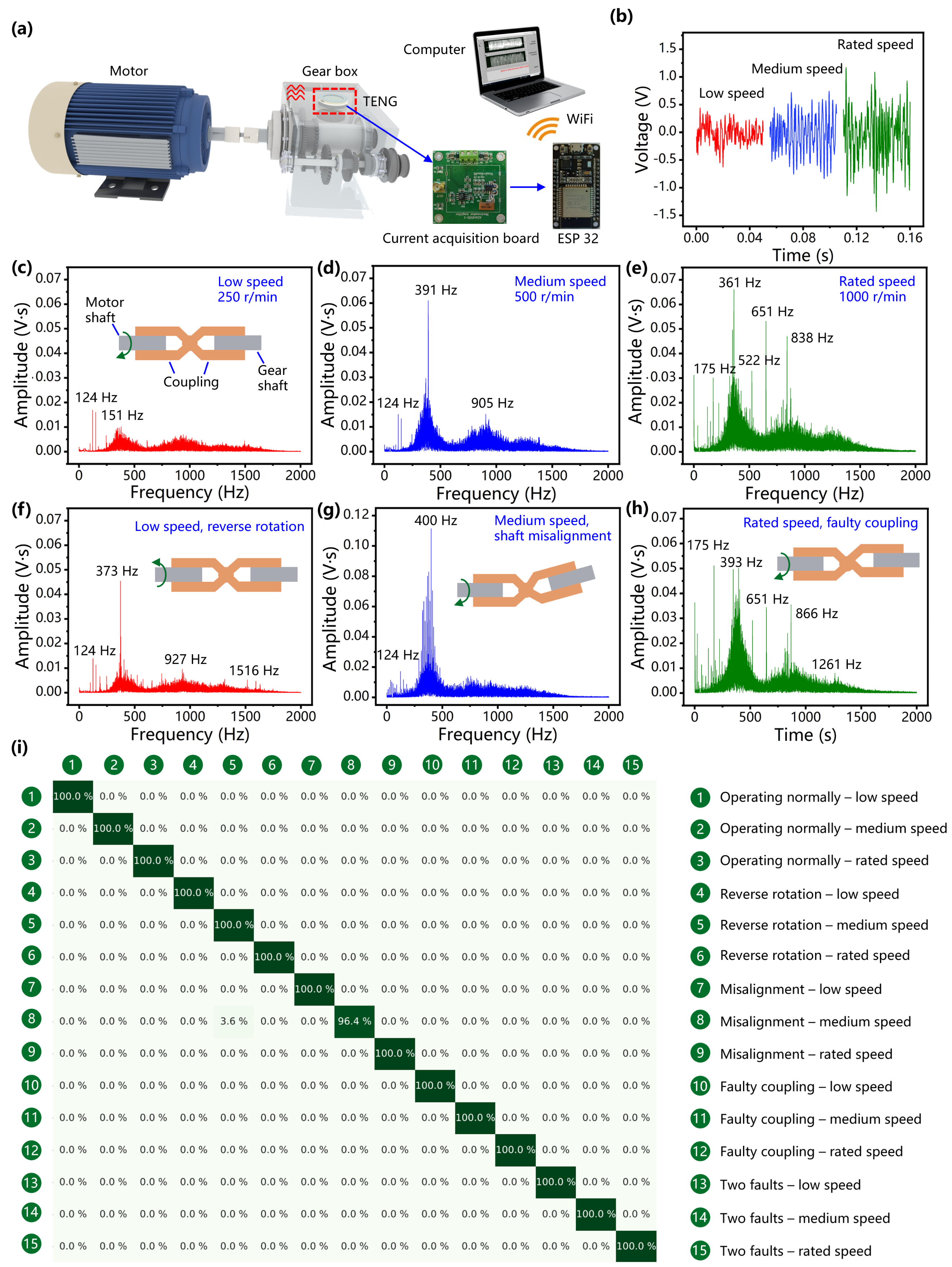 近日,清华大学深圳国际研究生院丁文伯助理教授的智能感知与机器人(Smart Sensing and Robotics, SSR)课题组开发了一种基于摩擦纳米发电机(TENG)的高灵敏度自驱动振动传感器。利用柔性介电薄膜与多孔金属材料构建摩擦层,有效提升了TENG传感精度,所制备的TENG传感器可以检测到1-2000 Hz频率的振动,即使在高温高湿的环境中,TENG传感器输出的信号在波形上不失真(幅值改变)。在实验室条件下将TENG传感器初步应用于机械齿轮系统的运行状态检测,将机器学习与TENG信号识别相结合,达到了高准度识别机械系统运行状态的目的,检测结果可实时显示在远程监控或者移动设备上。TENG传感器同时可用于空气压缩机、热风枪、砖瓦空鼓等方面的振动检测,并通过嵌入式系统将运行状态在屏幕显示。该工作为构建TENG自驱动传感器提供了新思路,在机械故障智能诊断方向具有应用潜力。