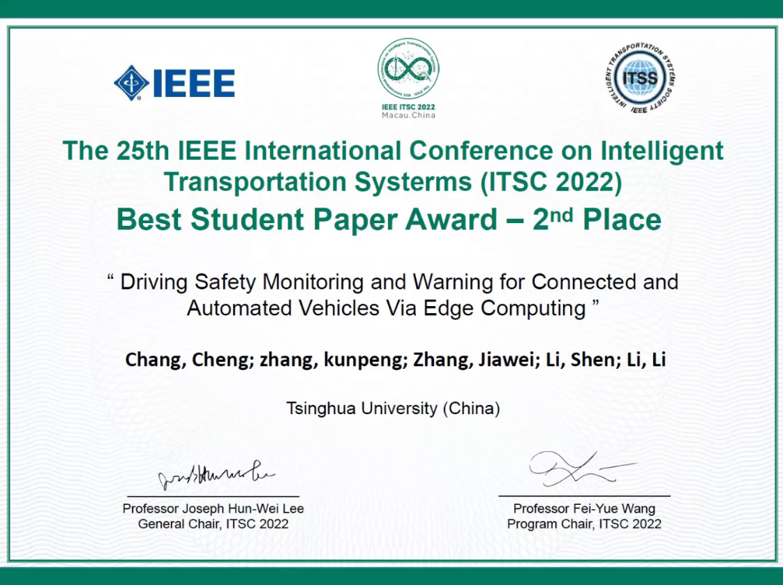 清华新闻网10月14日电 近日,第25届IEEE智能交通系统国际会议(IEEE International Conference on Intelligent Transportation Systems,ITSC)于中国澳门召开。ITSC是智能汽车与智能交通领域的国际顶级学术会议,此次会议收到全世界45个国家和地区的近1300篇投稿。大会评选了共3篇最佳学生论文奖(Best Student Paper Award),清华大学自动化系2021级博士生常成同学的论文《基于边缘计算的网联自动驾驶车辆的驾驶安全监控》(“Driving Safety Monitoring for Connected and Automated Vehicles via Edge Computing”)成功入选。
