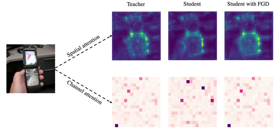团队也对FGD如何帮助学生模型学习进行了分析,对使用FGD蒸馏完成后的学生模型再次进行了注意力的可视化。研究结果表明,经过FGD蒸馏训练后的学生模型空间注意力和通道注意力的分布均与教师模型相似。这表明学生模型通过蒸馏学到了教师的知识,并获得更好的特征,由此实现性能提升。