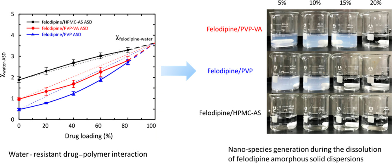 同时,采用了动态水吸附(DVS)研究了非洛地平ASD中药物与高分子在水分存在时的相互作用,结果详见图1中左图。PVP与PVP-VA ASD中,水分的存在有助于两组分的相互作用(曲线下凹),而HPMC-AS ASD中,水分的存在会破坏药物高分子的相互作用(曲线上凸)。这一实验现象与观察到的纳米物质的产生,具有一定的相关性。