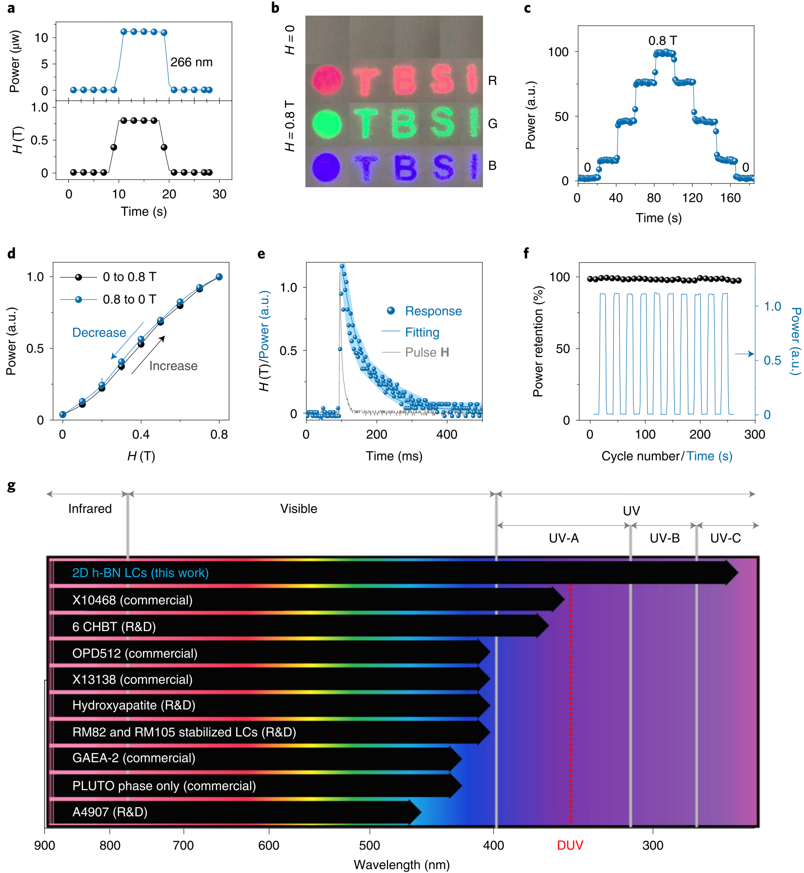 图3. 二维氮化硼无机液晶深紫外光调制器件性能及其与商用及R&D阶段光调制器的对比