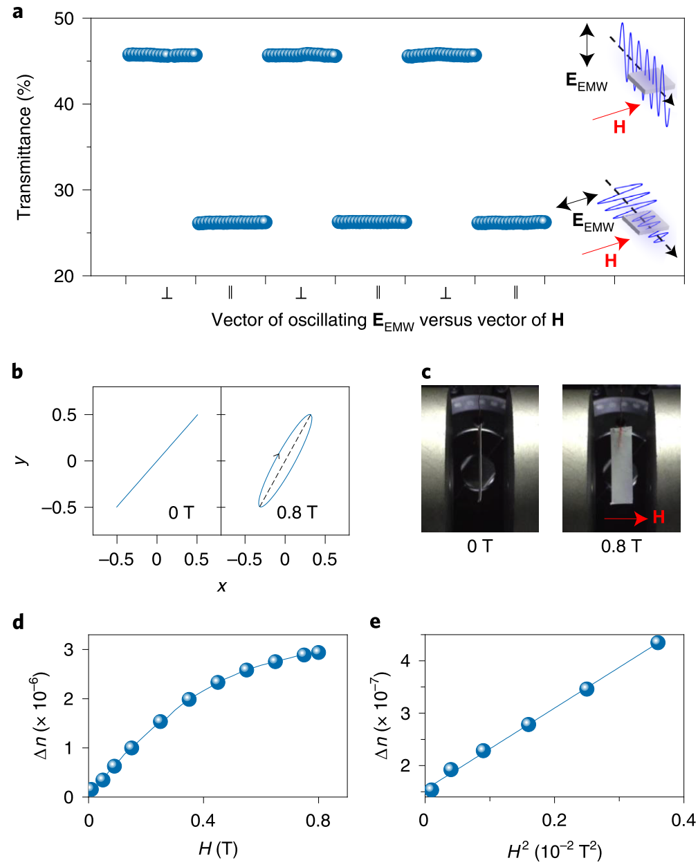 图2.二维氮化硼在磁场中的排布行为及二维材料无机液晶磁致双折射测量