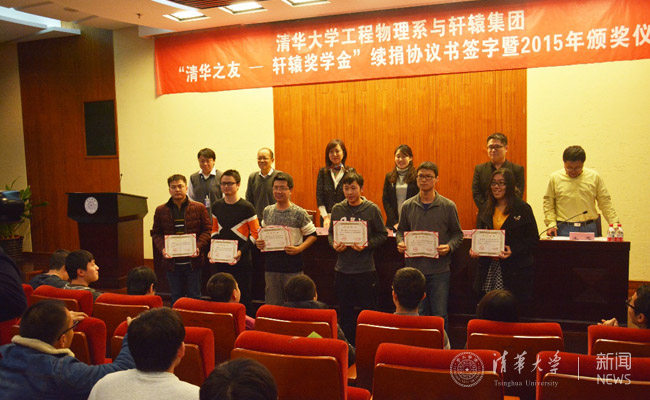 工物系副系主任王忠宣读2015学年“清华之友-轩辕奖学金”获奖学生名单,与会嘉宾与工物系领导共同为获奖学生颁奖。获奖学生代表,工物系本科生任逸在发言中表达了对轩辕集团的感谢,表示在以后的学习工作中一定会继续发扬清华大学“自强不息,厚德载物”的校风,脚踏实地地走好每一步,为社会和国家做出更大贡献。