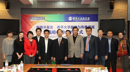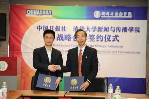 中国日报社副总编辑高岸明、清华新闻学院党委书记金兼斌签署协议。 王庆柱 摄