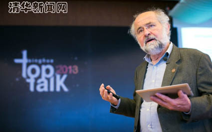 图为1991年诺贝尔生理学奖获得者埃尔文•内尔(Erwin Neher)在清华“巅峰对话”演讲。