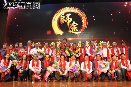 图为2014年“良师益友”颁奖晚会上陈吉宁校长与获奖教师合影。