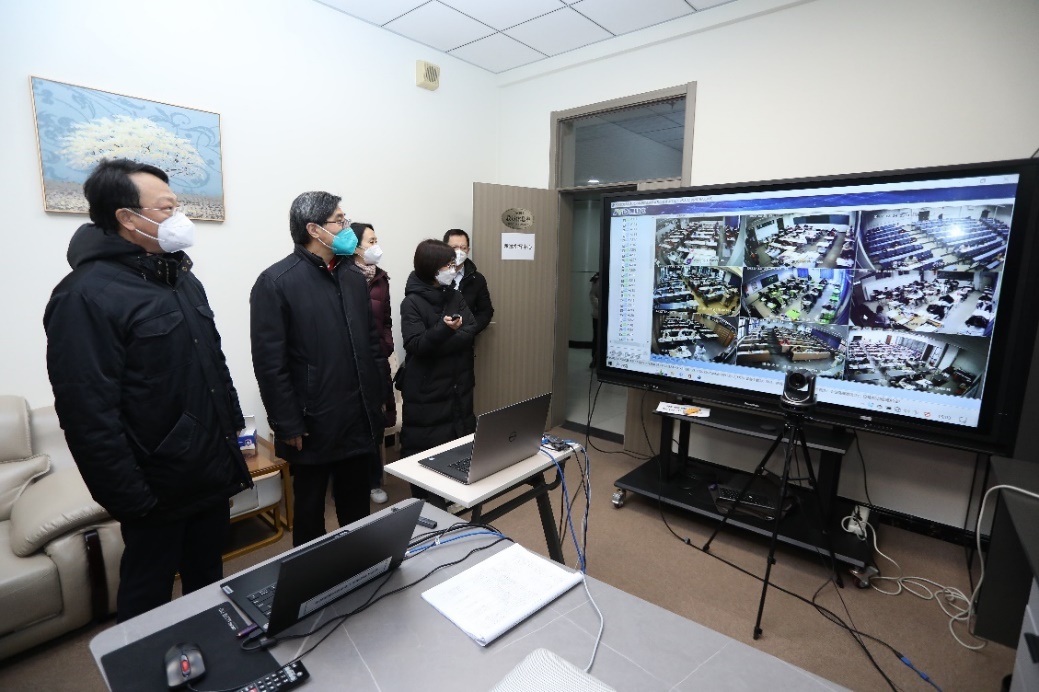 王希勤一行先后来到清华附中、六教A区考场,实地检查考场设置、考务组织、后勤保障、设备运行等情况。在六教A区指挥中心,王希勤通过远程巡查系统,认真检查全校各考场秩序、监考教师履职、考生纪律等,并听取相关部门关于学校各考场的情况汇报。