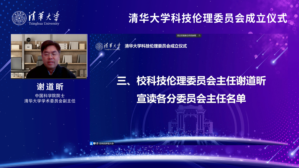 清华大学第一届科技伦理委员会主任由中国科学院院士、清华大学学术委员会副主任谢道昕和中国工程院院士、清华大学学术委员会委员、清华大学附属北京清华长庚医院院长董家鸿共同担任。会上,谢道昕宣读各分委员会主任名单,董家鸿宣读《清华大学科技伦理委员会委员承诺书》。