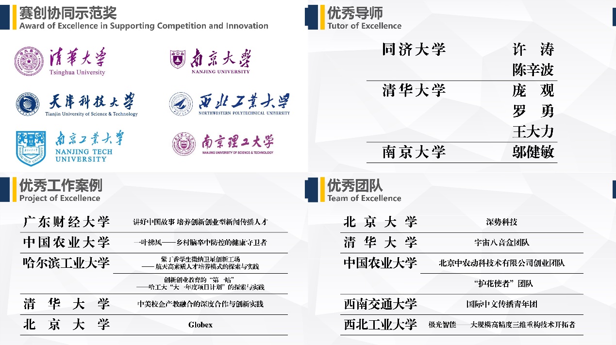 获评“优秀导师”的训练中心设计与原型实验室主任庞观指导学生获得中美青年创客大赛北京赛区二等奖、中美青年创客大赛-清华创客挑战赛优胜奖,通过多门课程连接北京大学、清华大学各专业院系,开展学生设计创新、实践创新的综合能力培养,建设了设计架连人文与工程的课组培养体系。训练中心双创教学部副部长罗勇组织落实了创客中心“课赛创一体化”创新实践教学平台建设,并指导学生在清华大学“互联网+”大赛、清华大学挑战杯、中国大学生工程实践与创新能力大赛等比赛中获得多项奖项。中国高校创新创业教育联盟秘书处项目主管王大力指导“宇宙八音盒”项目在中美青年创客大赛中获特等奖,并担任清华大学中国国际“互联网+”大学生创新创业大赛领队,带领团队为学校赢得大赛总冠军1项、总亚军1项、金奖4项、银奖2项。