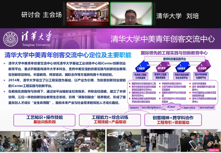 2022年中美青年创客交流中心建设研讨会由教育部国际合作与交流司、教育部创新创业教育指导委员会主办,来自清华大学、北京大学、复旦大学、温州大学等29家中美青年创客交流中心成员单位的100余人参会。
