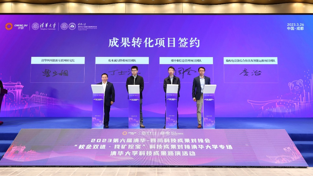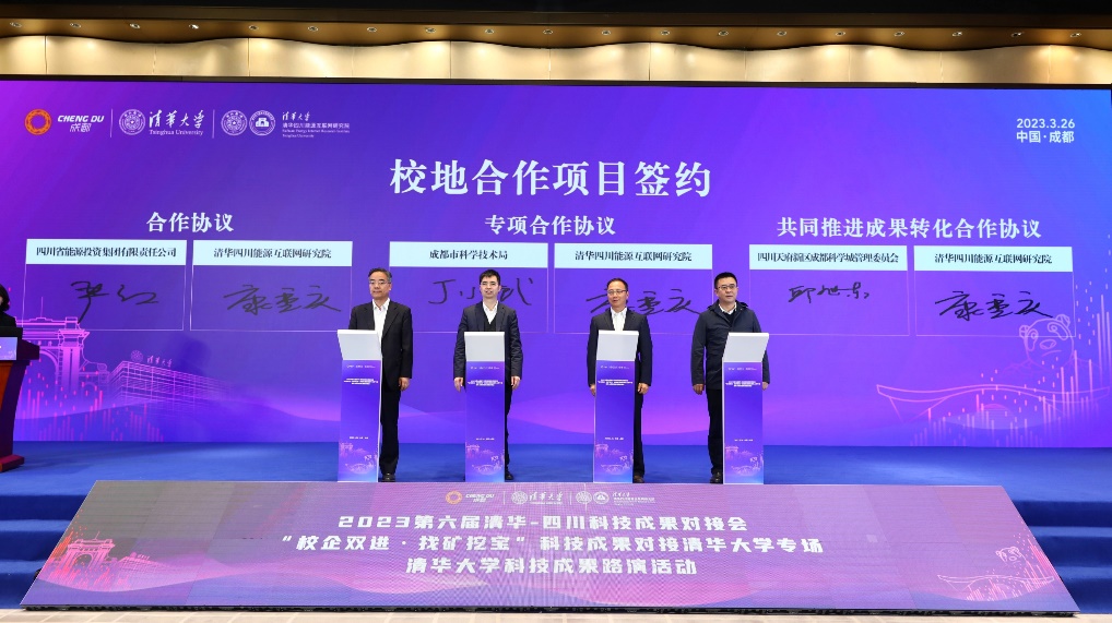 清华四川能源互联网研究院是省校、市校合作共建的重点平台,也是清华大学在川的成果转化基地。为推动清华大学成果与四川各市州和龙头企业的精准对接,在所有与会嘉宾的共同见证下,成都市科学技术局、四川省能源投资集团有限责任公司、四川天府新区成都科学城管委会分别与清华四川能源互联网研究院进行了校地合作项目签约。同时,清华四川能源互联网研究院在现场与新引进的三个高水平成果转化团队签署协议,进一步增强技术创新和成果转化能力。