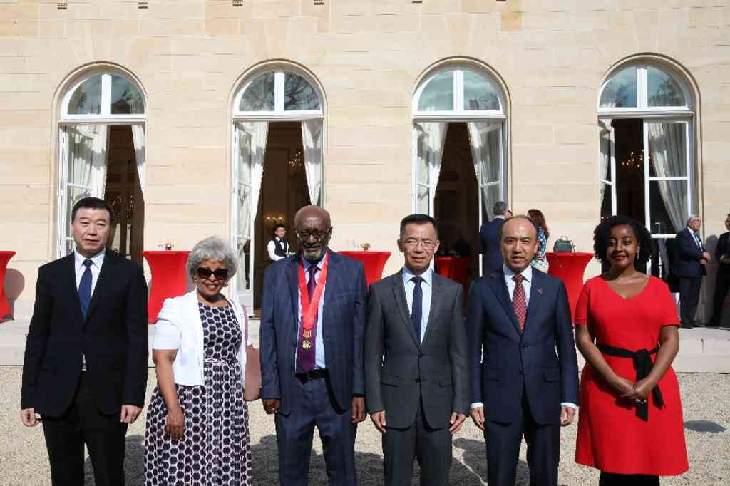 19日,王宏伟一行前往中国驻法国大使馆出席2022年度中国政府友谊奖颁奖仪式。活动现场,驻法国大使卢沙野向联合国教科文组织原副总干事、清华大学中国—非洲领导力发展中心联席主席格塔丘·恩吉达和法国蓝星安迪苏公司首席执行官、动物营养学专家让-马克·杜布朗颁发奖章和证书。法国科技、教育机构代表及使馆主要外交官等共约50人出席颁奖仪式。