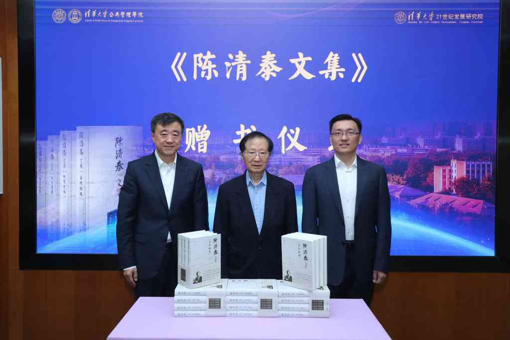 主旨演讲后进行了赠书仪式。杨斌代表清华大学、朱旭峰代表公共管理学院对陈清泰的捐赠表示感谢。